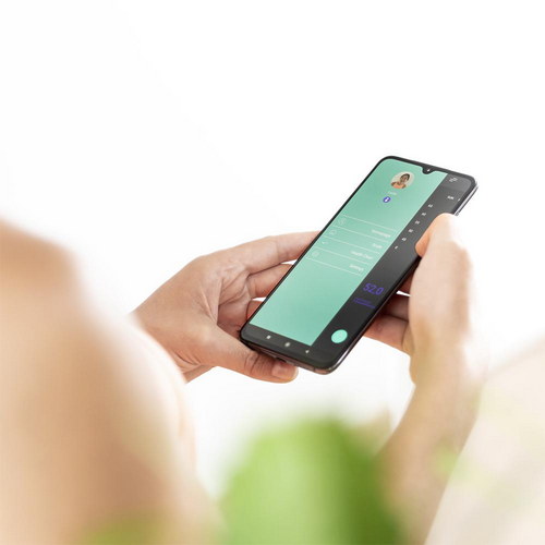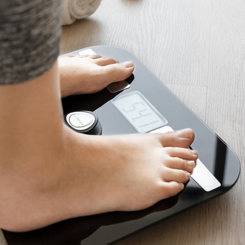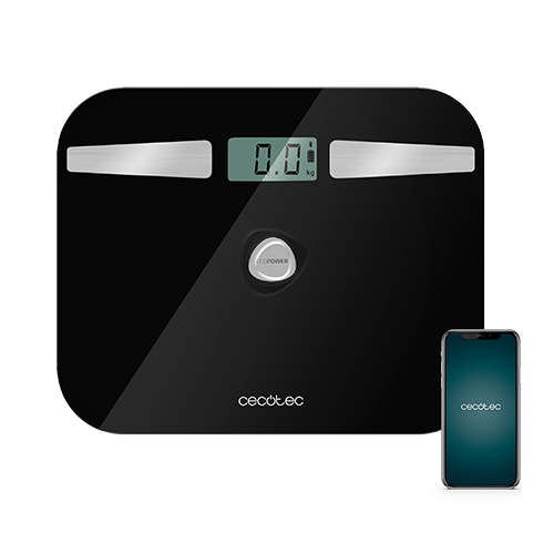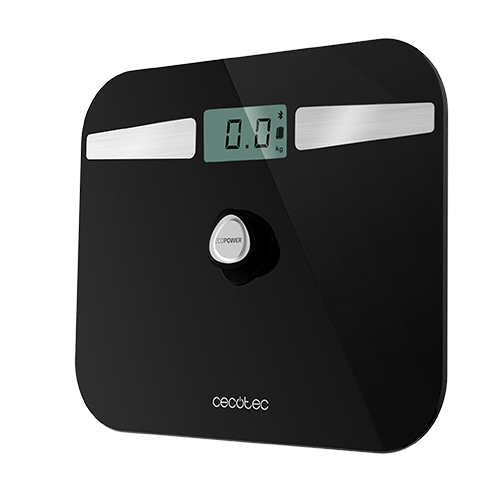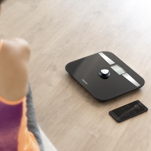 Balanza de baño con pulsador, superficie de vidrio templado de alta seguridad y sensores de precisión.
