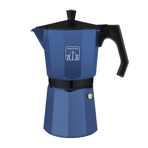 Cafetera italiana de aluminio con capacidad para 12 tazas de café en color azul, apta para todo tipo de cocinas y fácil de limpiar.
