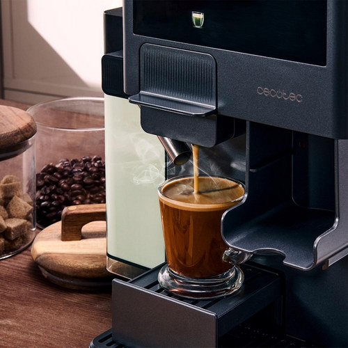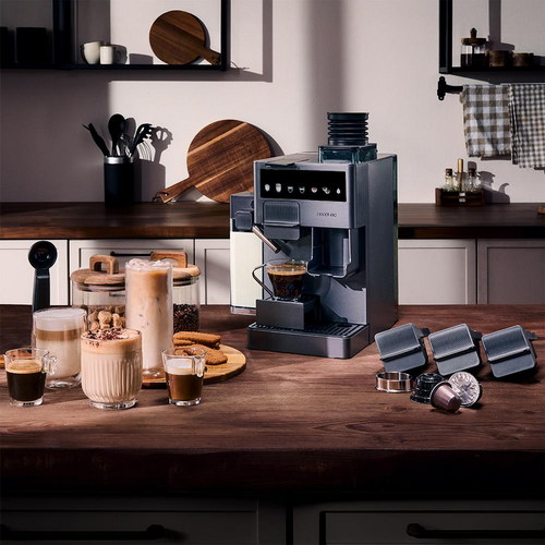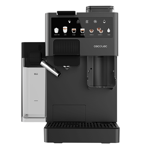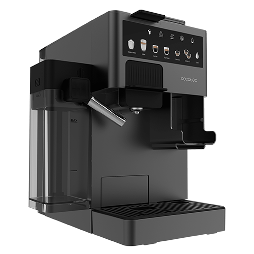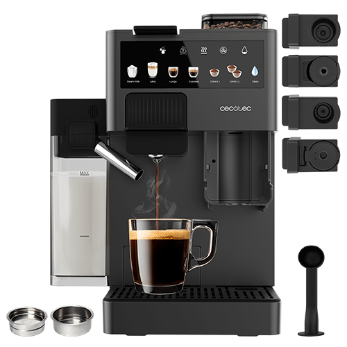 Cafetera de cápsulas con molinillo y depósito de leche.