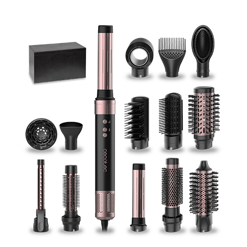 Moldeador multifunción 14 en 1 con tecnología Coanda que moldea, riza, peina, seca y elimina el efecto frizz. Con 3 velocidades, 3 temperaturas, y control inteligente del calor. Motor digital 1400 W de potencia y 110000 rpm. Cabezales con revestimiento de cerámica y keratina.