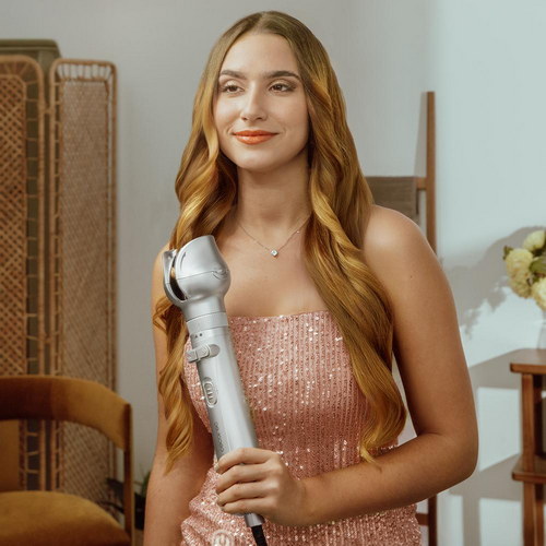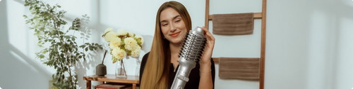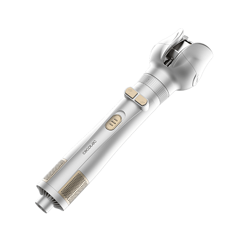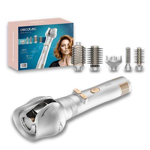 Cepillo de aire de 1100W con función rotativa que incluye 6 cabezales: cepillos, peine, difusor y un rizador automático.