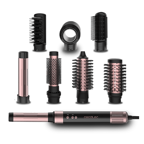Moldeador multifunción 8 en 1 con tecnología Coanda que moldea, riza, peina, seca y elimina el efecto frizz. Con 3 velocidades, 3 temperaturas, y control inteligente del calor. Motor digital 1400 W de potencia y 110000 rpm. Cabezales con revestimiento de cerámica, keratina y aceite de almendras.