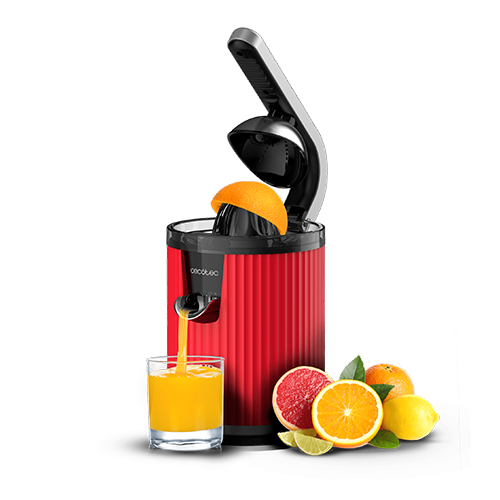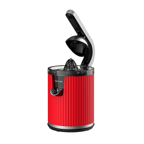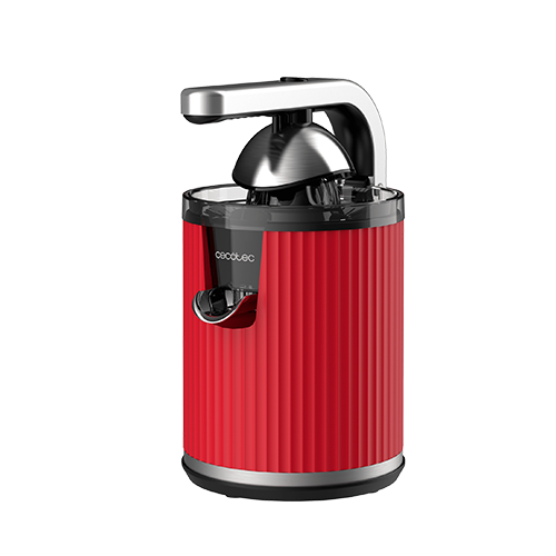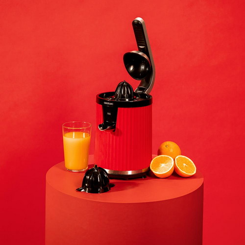 Exprimidor eléctrico de brazo retro para naranjas y cítricos con 600 W de potencia, filtro de acero inoxidable, un cono de plástico, palanca para extraer la pulpa y sistema antigoteo.