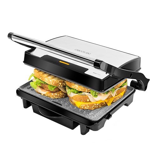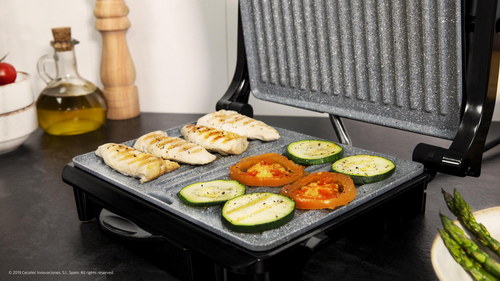 Parrilla eléctrica con Revestimiento de Piedra RockStone, Placa Superior Adaptable en Altura, Bandeja recogegrasas,1500W de Potencia, Revestimiento ecológico