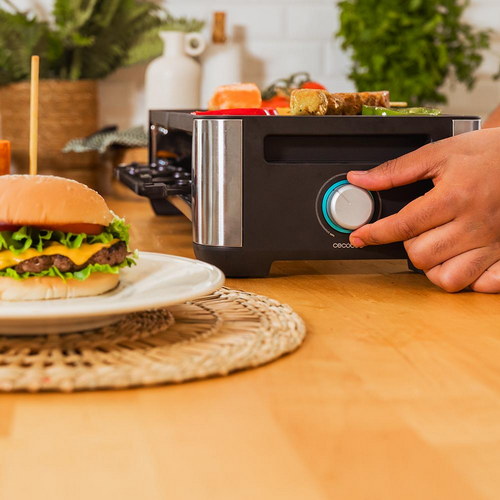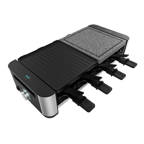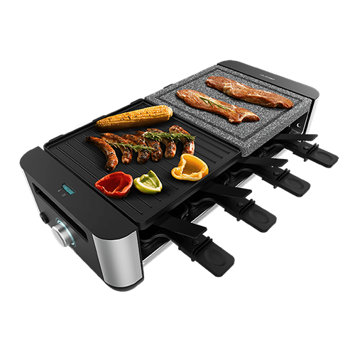 Máquina de Raclette para 8 personas con grill de 1400 W. Con estructura de diseño con acabados en acero inoxidable, termostato regulable y dos placas de asar una de aluminio fundido con revestimiento antiadherente y la otra de piedra natural. Incluye 8 sartenes pequeñas antiadherentes y 8 espátulas de madera.
