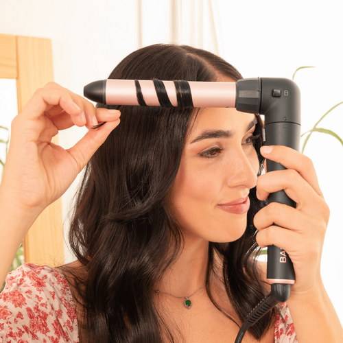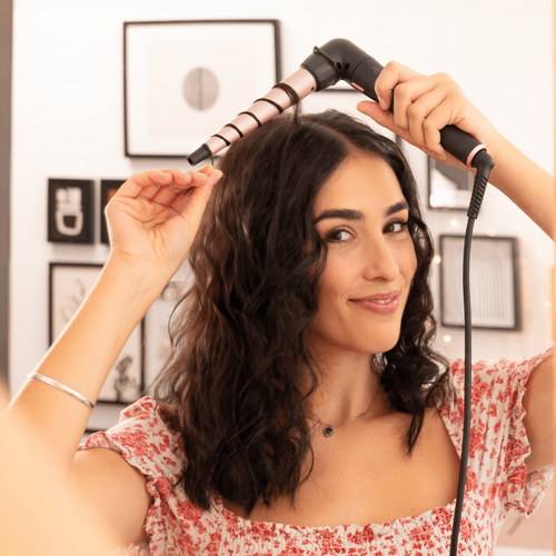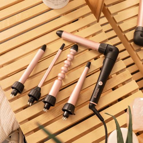 Rizador de pelo multicabezal con 5 cabezales para hacer diferentes rizos, con un codo de 90 grados que asegura mayor comodidad de uso y con guante térmico, estuche y 2 clips.
