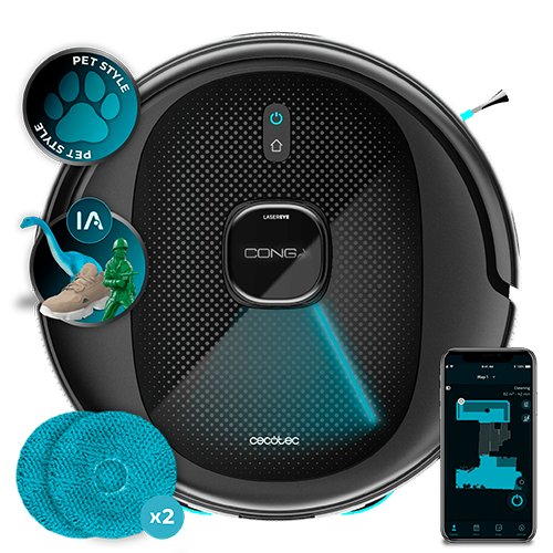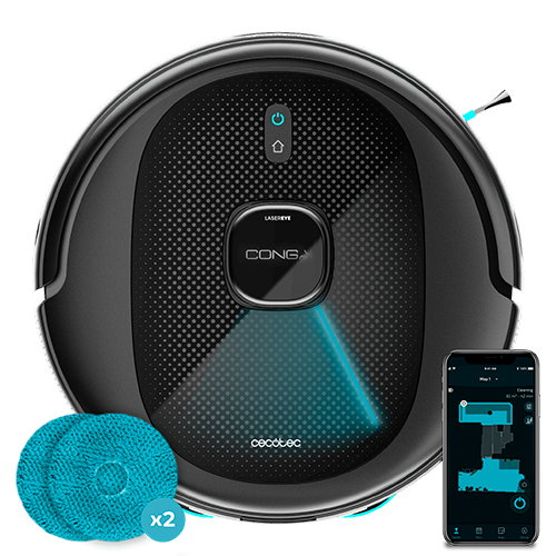 Robot aspirador con navegación láser inteligente 4 en 1: barre, aspira, friega y pasa las mopas. 10.000 Pa de succión. Máximo 240 minutos de autonomía. Fregado profesional con mopas giratorias. Cepillo de silicona, óptimo para pelo de mascotas. 1 cepillo lateral. 4 niveles de potencia de aspiración y fregado. Control APP Cecotec y asistentes virtuales.