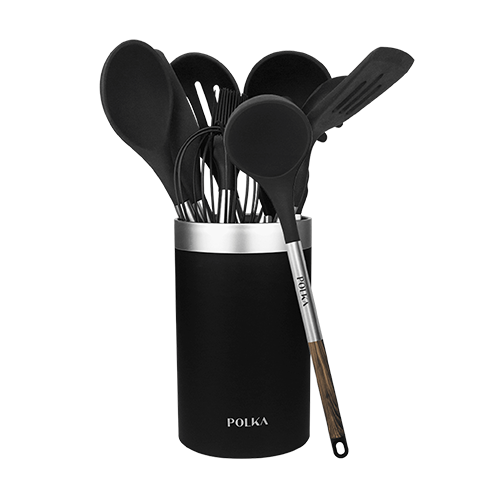 Utensilios de Cocina de Silicona de 9 piezas Negro, Recubierto Soft touch y Mango efecto Madera. Materiales: Silicona, Nylon y PP, Incluye Holder Polka