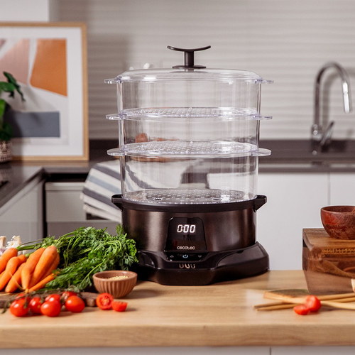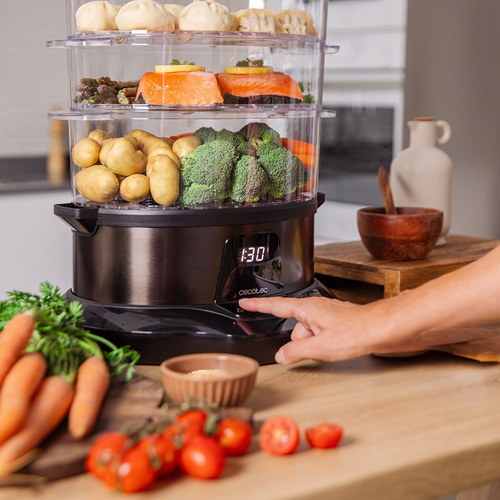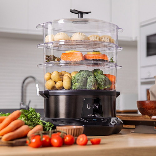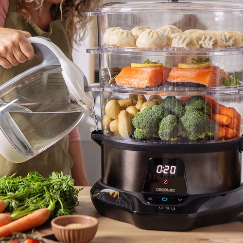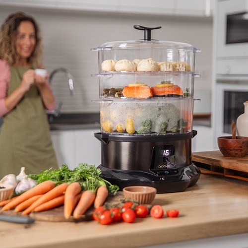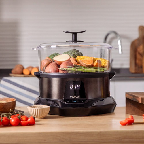 Vaporera para cocinar rápido y saludable con 1L de capacidad, gracias a su potencia de 1000w. Tiempo ajustable y Apto para lavavajillas