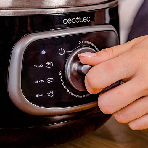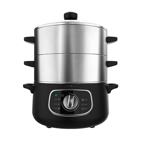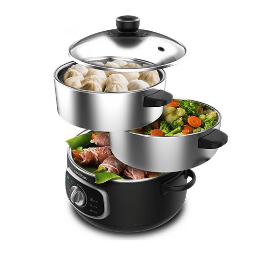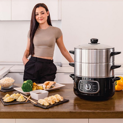 Vaporera eléctrica de 1300 W, con 3 recipientes de acero inoxidable y 10 L de capacidad total.