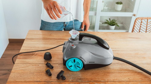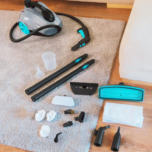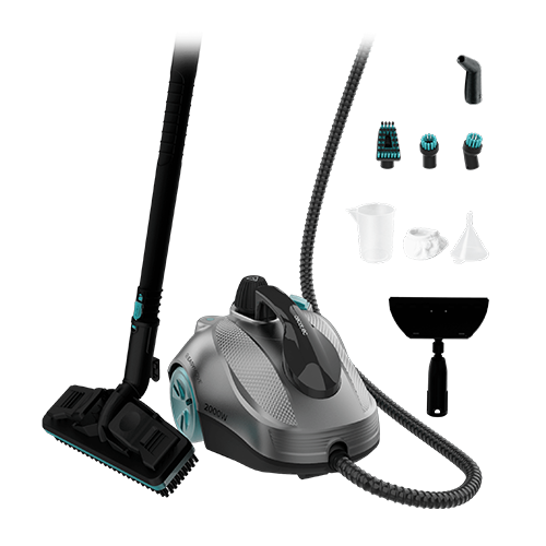 Vaporeta de trineo con potencia de 2000W. Limpia y desinfecta para acabados perfectos. Hasta 150 minutos de trabajo continuo ininterrumpido. Depósito XXL de 2l . 5 bares de presión. Kit de 16 accesorios. Limpia en cualquier superficie